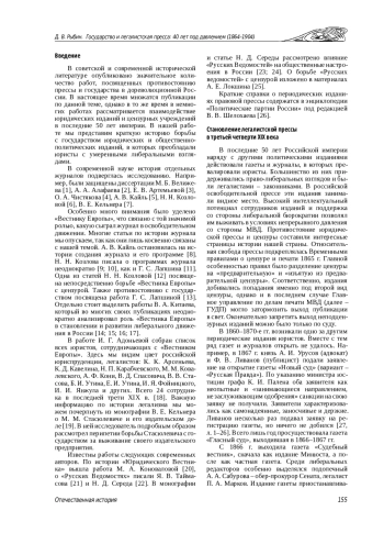 В советской и современной исторической литературе опубликовано значительное количество работ, посвященных противостоянию прессы и государства в дореволюционной России. В настоящее время множатся публикации по данной теме, однако в то же время в немногих работах рассматривается взаимодействие юридических изданий и цензурных учреждений в последние 50 лет империи. В нашей работе мы представим краткую историю борьбы с государством юридических и общественно политических изданий, в которых преобладали юристы с умеренными либеральными взглядами.