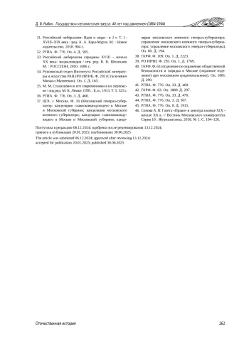 25. Локшин А. Е. Газета “Русские ведомости” и администрация в период политической реакции 80 - начала 90-х гг. XIX века // Вестник Московского университета. Серия 8. История. 1980. № 6. С. 53-66.