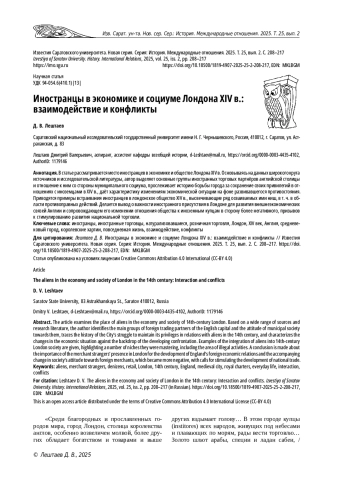 В статье рассматривается место иностранцев в экономике и обществе Лондона XIV в. Основываясь на данных широкого круга источников и исследовательской литературы, автор выделяет основные группы иностранных торговых партнёров английской столицы и отношение к ним со стороны муниципального социума, прослеживает историю борьбы города за сохранение своих привилегий в отношениях с иноземцами в XIV в., даёт характеристику изменениям экономической ситуации на фоне развивавшегося противостояния. Приводятся примеры встраивания иностранцев в лондонское общество XIV в., высвечивающие ряд осваиваемых ими ниш, в т. ч. в области противоправных действий. Делается вывод о важности иностранного присутствия в Лондоне для развития внешнеэкономических связей Англии и сопровождающем его изменении отношения общества к иноземным купцам в сторону более негативного, призывов к стимулированию развития национальной торговли.