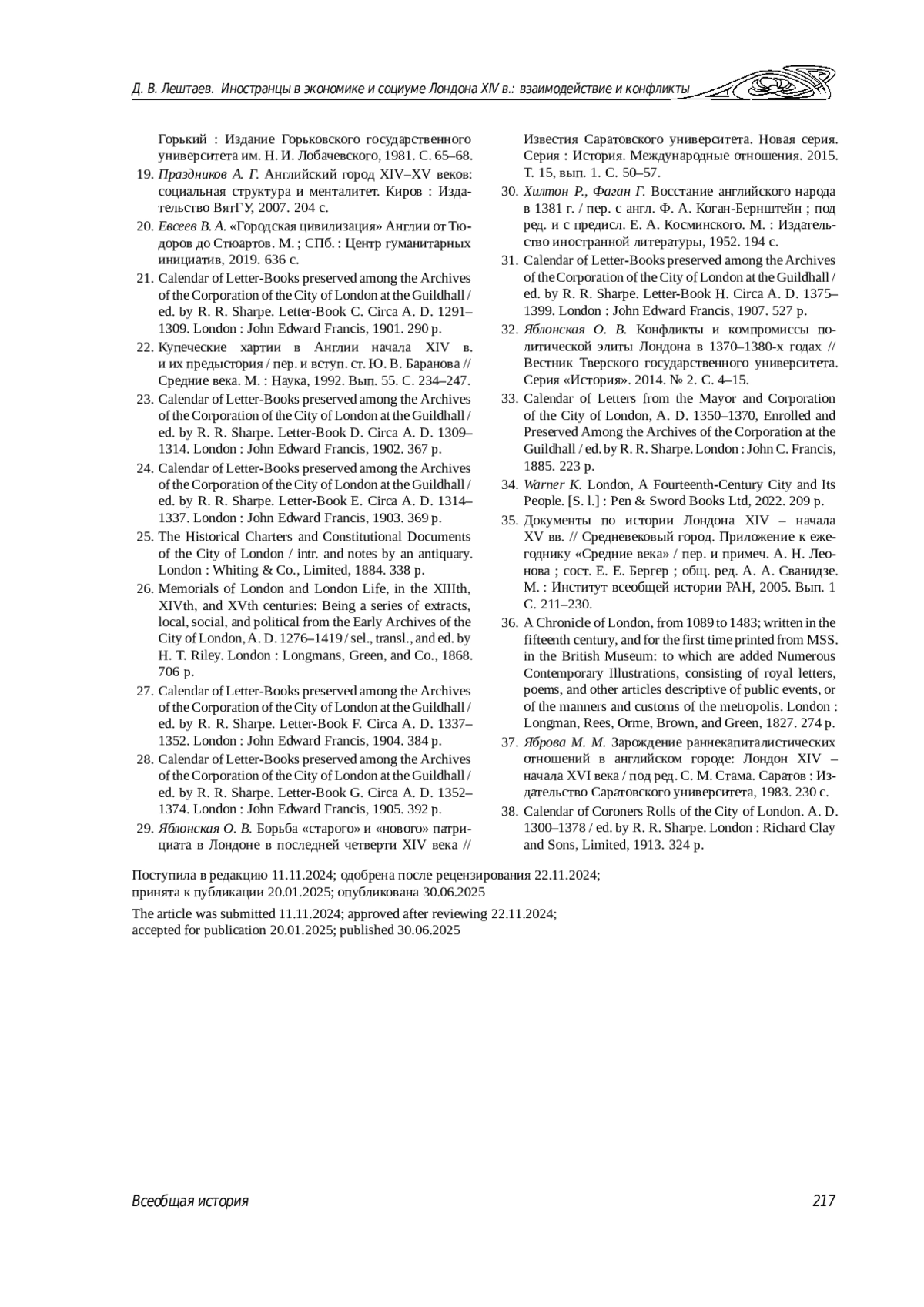35. Документы по истории Лондона XIV - начала XV вв. // Средневековый город. Приложение к ежегоднику “Средние века” / пер. и примеч. А. Н. Леонова; сост. Е. Е. Бергер; общ. ред. А. А. Сванидзе. М.: Институт всеобщей истории РАН, 2005. Вып. 1 С. 211-230.