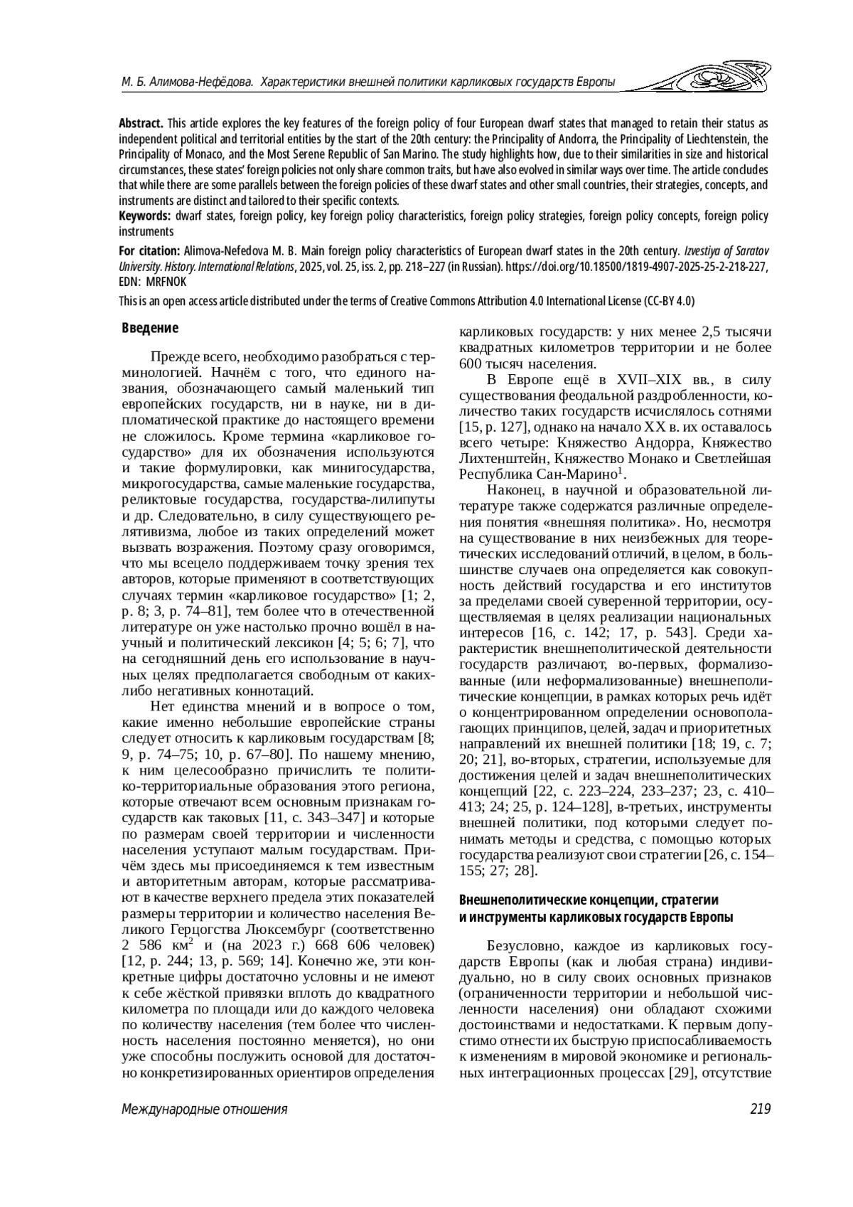 Статья посвящена рассмотрению основных характеристик внешней политики четырёх сохранивших себя к началу XX века в качестве самостоятельных политико-территориальных образований европейских карликовых государств: Княжества Андорры, Княжества Лихтенштейн, Княжества Монако и Светлейшей Республики Сан-Марино. Показано, что эти характеристики, в силу одинаковых основных признаков этих государств и единых исторических условий их существования, в целом не только совпадают между собой, но и на протяжении исследуемого периода имеют общую динамику своих изменений. Сделан вывод о том, что, хотя основные характеристики внешней политики карликовых государств Европы и малых стран частично совпадают, внешнеполитические концепции, инструменты внешней политики, и прежде всего – внешнеполитические стратегии указанных карликовых государств обладают своей собственной спецификой.