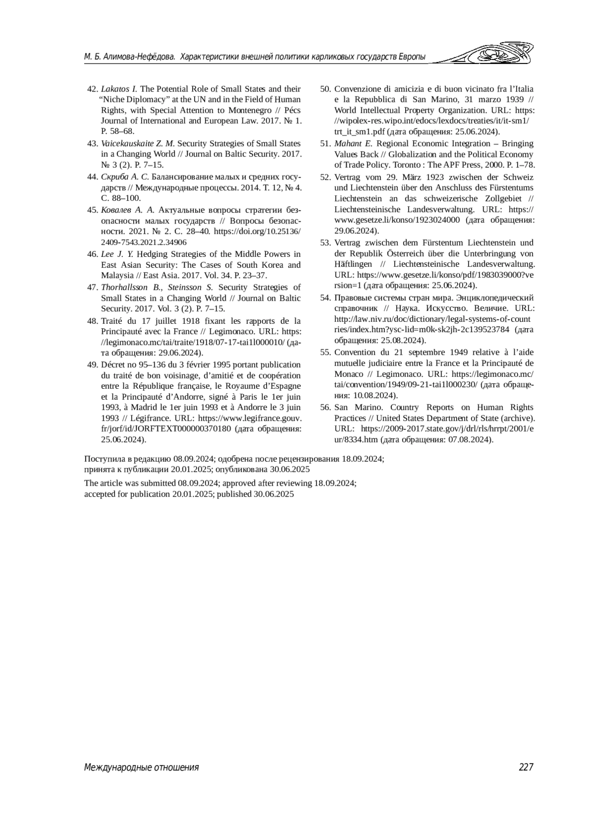 42. Lakatos I. The Potential Role of Small States and their “Niche Diplomacy” at the UN and in the Field of Human Rights, with Special Attention to Montenegro // Pécs Journal of International and European Law. 2017. № 1. P. 58-68.