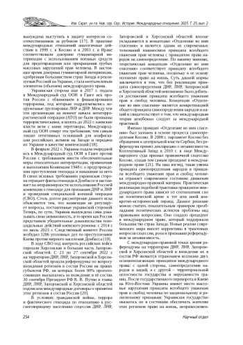 В статье представлены историко-правовые аспекты украинского кризиса в контексте развития современного международного права. События на Украине в 2014–2024 гг. актуализировали многие институты современного международного права: иерархию принципов территориальной целостности государств и права народов на самоопределение, проблему сецессии и роль референдумов в создании новых независимых государств, вопрос их признания на международной арене и защиты соотечественников за рубежом. Слабая кодификация норм права, их различное толкование и отсутствие готовых решений на вызовы современности свидетельствуют о том, что современное международное право представляет собой своеобразный баланс, расклад сил в международных отношениях, который может меняться в зависимости от различных факторов. Авторский анализ показывает, что новые реалии современного мира вносят коррективы в трактовках вопросов сецессии, роли и признания референдумов за независимость. Концепция «Отделение во имя спасения» является одним из современных проявлений взаимосвязи принципа всеобщего уважения прав человека с принципом права народов на самоопределение.