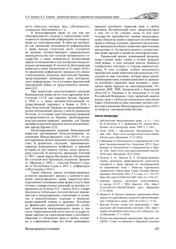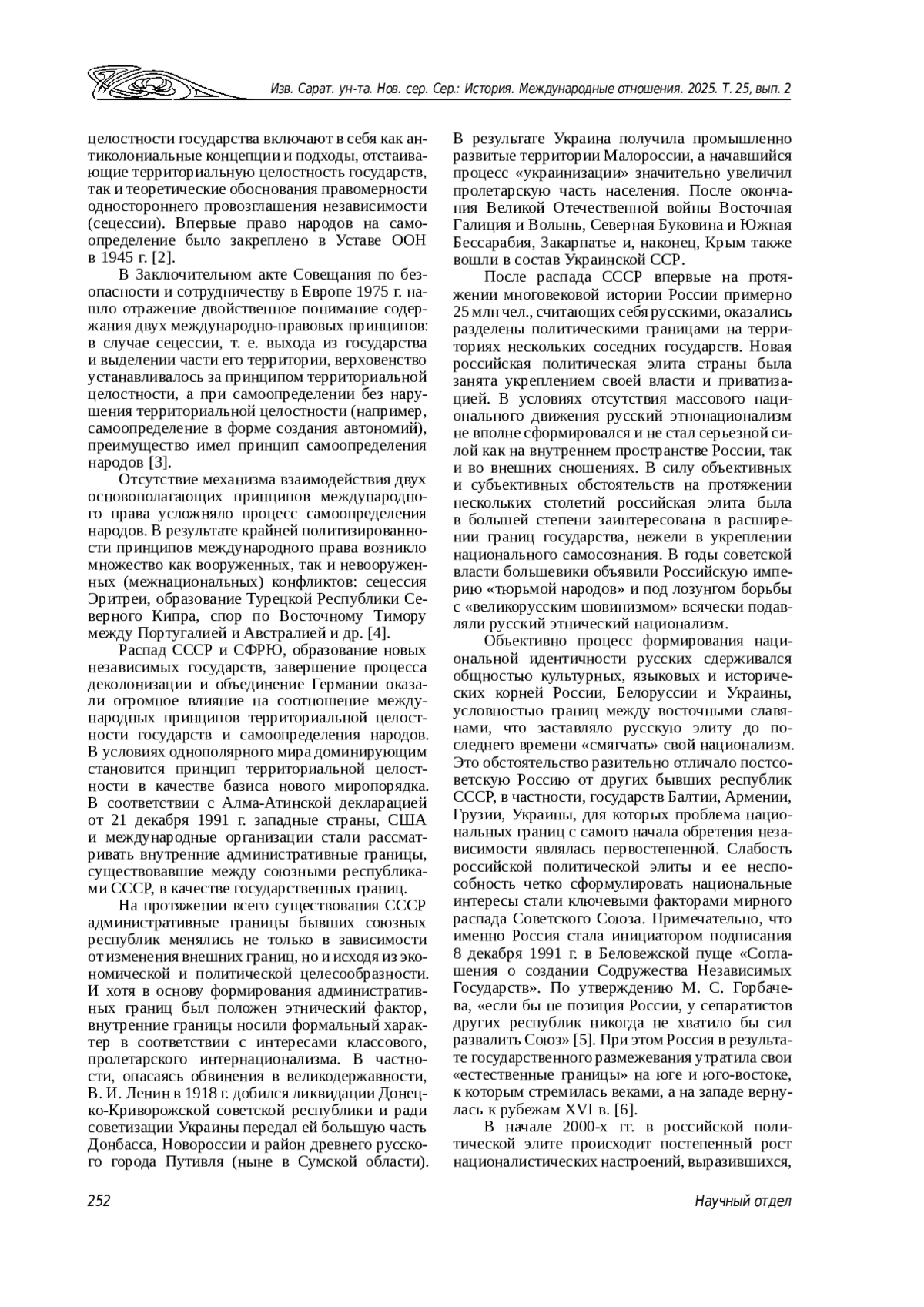 4. Чолахян А. В., Чолахян В. А. Историко-правовые основы принципов территориальной целостности государств и права народов на самоопределение на современном этапе // Известия Саратовского университета. Новая серия. Серия: История. Международные отношения. 2022. Т. 22, вып. 3. С. 370-377. DOI: 10.18500/1819-4907-2022-22-3-370-377 EDN: MCUPOX