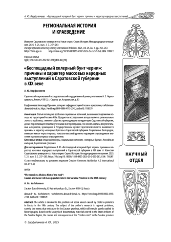 Статья посвящена проблеме социальных волнений, вызванных эпидемиями холеры на территории России в XIX в. Предметом исследования автора являются региональные аспекты проблемы, а именно события, происходившие на территории Саратовской губернии, до сих пор остающиеся малоизученными в историографии. На основе анализа документальных материалов, хранящихся в Государственном архиве Саратовской области, выявляются причины и характер «холерных бунтов» в Саратовской губернии. Социальные беспорядки, имевшие явные черты погрома, показали высокий уровень недоверия к проводимым властями противохолерным мероприятиям.
