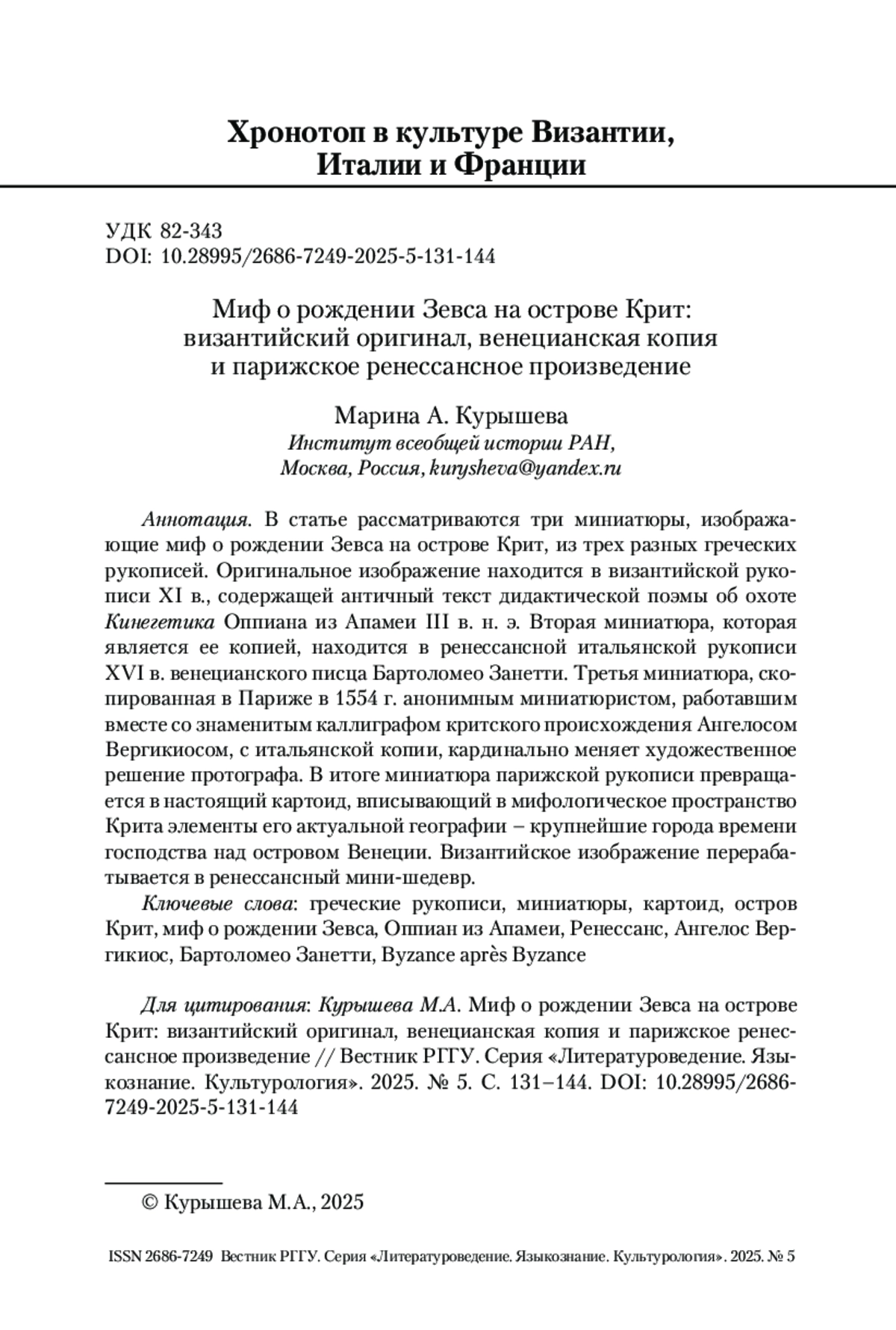 КУРЫШЕВА М. А. МИФ О РОЖДЕНИИ ЗЕВСА НА ОСТРОВЕ КРИТ: ВИЗАНТИЙСКИЙ ОРИГИНАЛ, ВЕНЕЦИАНСКАЯ КОПИЯ И ПАРИЖСКОЕ РЕНЕССАНСНОЕ ПРОИЗВЕДЕНИЕ // ВЕСТНИК РГГУ. СЕРИЯ «ЛИТЕРАТУРОВЕДЕНИЕ. ЯЗЫКОЗНАНИЕ. КУЛЬТУРОЛОГИЯ». 2025. № 5