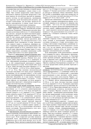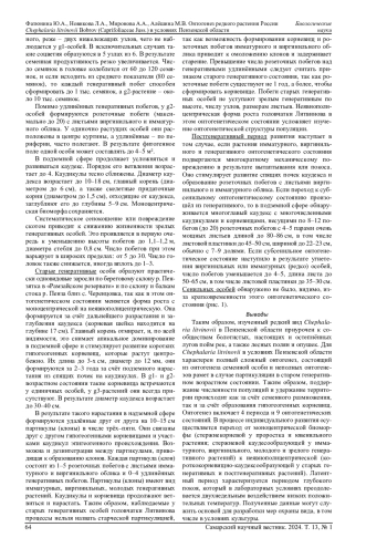 В статье рассматриваются особенности онтогенеза, формирования биоморфы (в онтогенетическом аспекте) и фитоценотическая приуроченность в условиях Пензенской области редкого растения России эндемика головчатки Литвинова Chephalaria litvinovii Bobrov. Методы полевых исследований дополняются лабораторным экспериментом по влиянию низких положительных температур на всхожесть семянок. Проведенные исследования показали, что индивидуальное развитие особей этого вида включает 4 периода и 9 онтогенетических состояний, морфометрические показатели которых представлены в работе. Показано, как моноцентрическая биоморфа этого каудексного поликарпика в старом генеративном возрастном состоянии сменяется неявнополицентрической за счёт формирования гипогеогенных корневищ. Показано стимулирующее действие температуры +2°C в течение 2 недель на всхожесть семянок. Отмечается фитоценотическая приуроченность C. litvinovii к болотистым и реже - к настоящим и остепнённым лугам в поймах рек, а также по лесным полянам и опушкам. Полученные материалы могут служить основой для разработки более эффективных мероприятий по охране вида, в том числе в условиях культуры при интродукции в условиях ботанических садов.