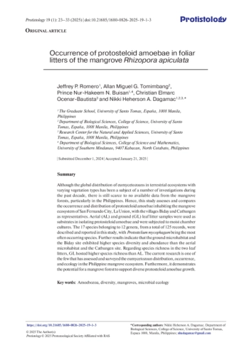 35. Ocenar-Bautista C.E., Balaoro-Banzuela R.C., Claudio-Paragas C.Y., Buebos-Esteve D.E. et al. 2024. First records of protosteloid amoebae isolated from coastal litter in the Philippines. Check List. 20 (2): 249-257. DOI: 10.15560/20.2.1