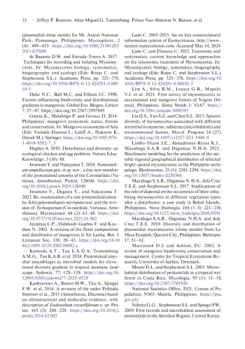 24. Lim A., Silva R.M., Lesaca G.R., Mapalo V.J. et al. 2021. First survey of myxomycetes in successional and mangrove forests of Negros Oriental, Philippines. Slime Molds 1: V1A7. DOI: 10.5281/zenodo.5098397