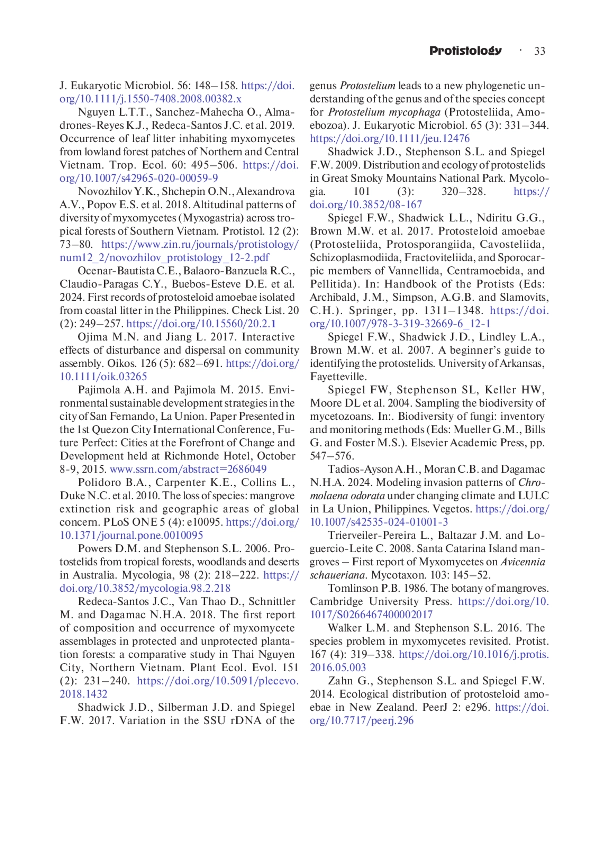 33. Nguyen L.T.T., Sanchez-Mahecha O., Alma- drones-Reyes K.J., Redeña-Santos J.C. et al. 2019. Occurrence of leaf litter inhabiting myxomycetes from lowland forest patches of Northern and Central Vietnam. Trop. Ecol. 60: 495-506. DOI: 10.1007/s42965-020-00059-9