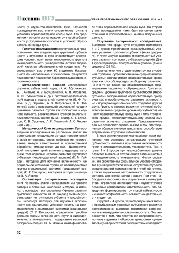 Статья: АКТУАЛИЗАЦИЯ ГРУППОВОЙ СУБЪЕКТНОСТИ У СТУДЕНТОВ-ПСИХОЛОГОВ В УСЛОВИЯХ ОБРАЗОВАТЕЛЬНОЙ СРЕДЫ ВУЗА (2025)