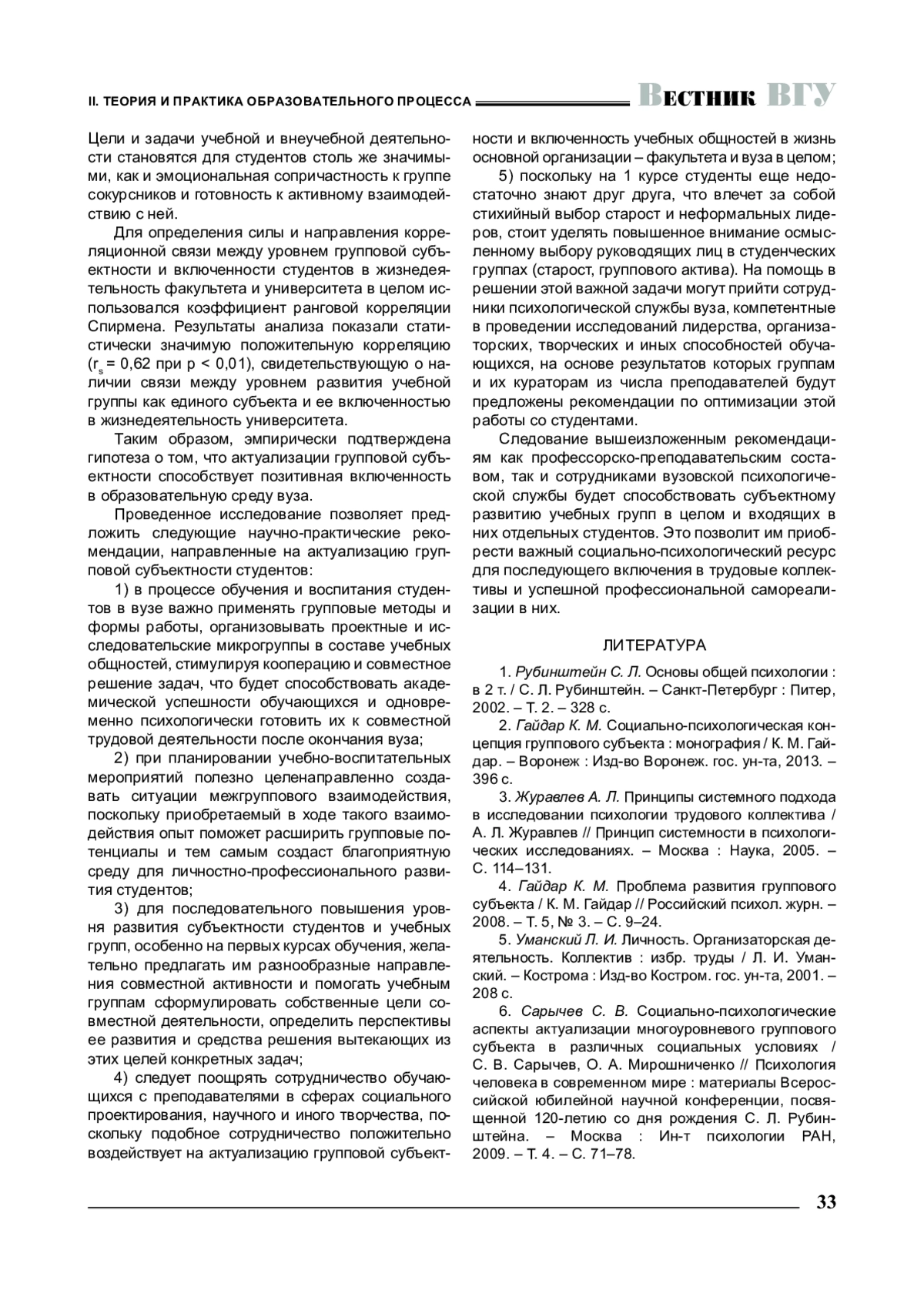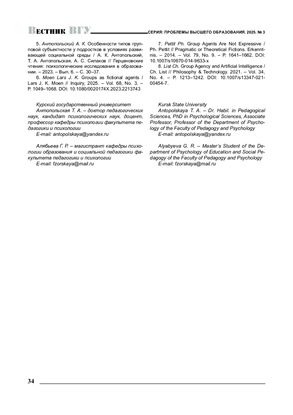 АНТОПОЛЬСКАЯ Т. А., АЛЯБЬЕВА Г. Р. АКТУАЛИЗАЦИЯ ГРУППОВОЙ СУБЪЕКТНОСТИ У СТУДЕНТОВ-ПСИХОЛОГОВ В УСЛОВИЯХ ОБРАЗОВАТЕЛЬНОЙ СРЕДЫ ВУЗА // ВЕСТНИК ВОРОНЕЖСКОГО ГОСУДАРСТВЕННОГО УНИВЕРСИТЕТА. СЕРИЯ: ПРОБЛЕМЫ ВЫСШЕГО ОБРАЗОВАНИЯ. 2025. № 3
