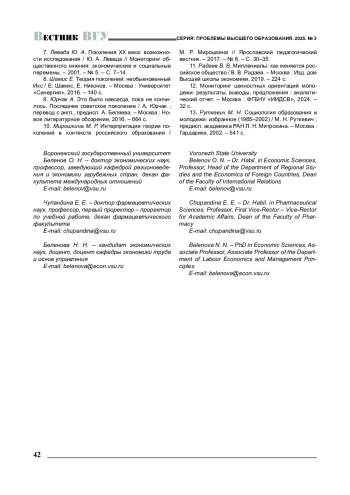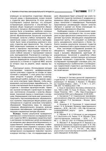 1. Вепрева И. Система ценностей современного студенчества: от семейного благополучия до самореализации / И. Вепрева, Т. Ицкович, О. Михайлова // Quaestio Rossica. - 2023. - Т. 11, № 1. - С. 277288. DOI: 10.15826/qr.2023.1.789.