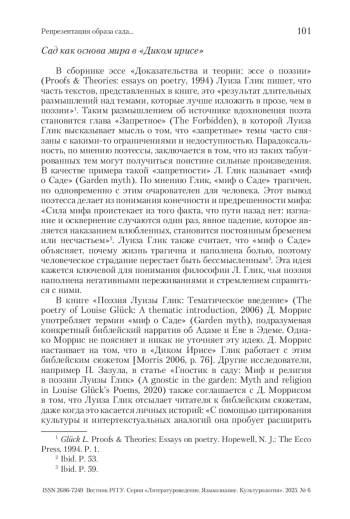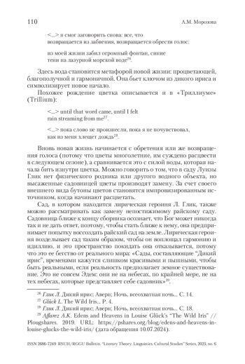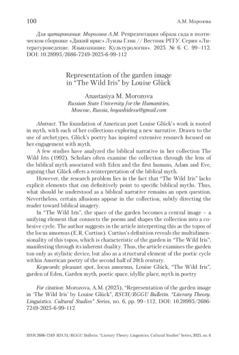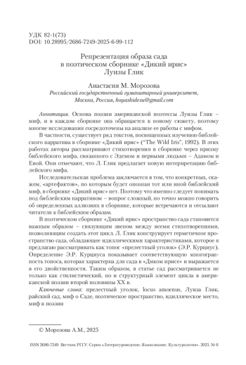 В поэтическом сборнике «Дикий ирис» пространство сада становится важным образом – связующим звеном между всеми стихотворениями, позволяющим создать этот цикл. Л. Глик конструирует герметичное пространство сада, обладающее идиллическими характеристиками, которое я предлагаю рассматривать как топос «прелестный уголок» (Э. Р. Курциус). Определение Э. Р. Курциуса показывает соответствующую многогранность топоса, которая характерна для сада в «Диком ирисе» и выражается в его двойственности. Таким образом, в статье сад рассматривается не только как стилистический, но и структурный элемент цикла в американской поэзии второй половины ХХ в.