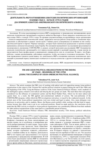 Статья: ДЕЯТЕЛЬНОСТЬ ФБР В ОТНОШЕНИИ АЗИАТСКИХ ПОЛИТИЧЕСКИХ ОРГАНИЗАЦИЙ В КОНЦЕ 1960-Х - НАЧАЛЕ 1970-Х ГОДОВ (НА ПРИМЕРЕ АЗИАТСКО-АМЕРИКАНСКОГО ПОЛИТИЧЕСКОГО АЛЬЯНСА) (2024)