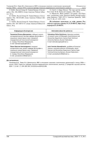 ТОКМАКОВА П. Д., ЛЕВИН Я. А. ДЕЯТЕЛЬНОСТЬ ФБР В ОТНОШЕНИИ АЗИАТСКИХ ПОЛИТИЧЕСКИХ ОРГАНИЗАЦИЙ В КОНЦЕ 1960-Х - НАЧАЛЕ 1970-Х ГОДОВ (НА ПРИМЕРЕ АЗИАТСКО-АМЕРИКАНСКОГО ПОЛИТИЧЕСКОГО АЛЬЯНСА) // САМАРСКИЙ НАУЧНЫЙ ВЕСТНИК. 2024. ТОМ 13, № 1