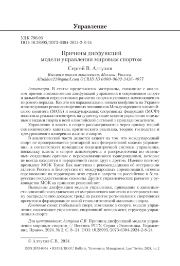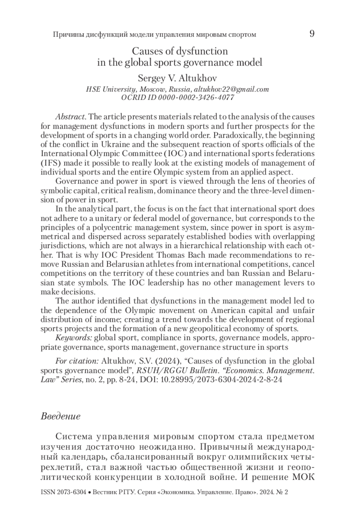 В статье представлены материалы, связанные с анализом причин возникновения дисфункций управления в современном спорте и дальнейшими перспективами развития спорта в условиях изменяющегося мирового порядка. Как это ни парадоксально, начало конфликта на Украине и последующая реакция спортивных чиновников Международного олимпийского комитета (МОК) и международных спортивных федераций (МСФ) позволила реально посмотреть на существующие модели управления отдельными видами спорта и всей олимпийской системой в прикладном аспекте.