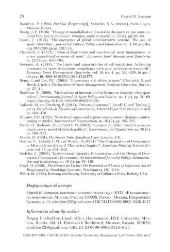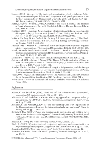 12. Geeraert 2018 - Geeraert A. The limits and opportunities of self-regulation: Achieving international sport federations’ compliance with good governance standards // European Sport Management Quarterly. 2018. Vol. 19. Iss. 4. P. 520- 538. https://doi.org/10.1080/16184742.2018.1549577.