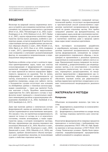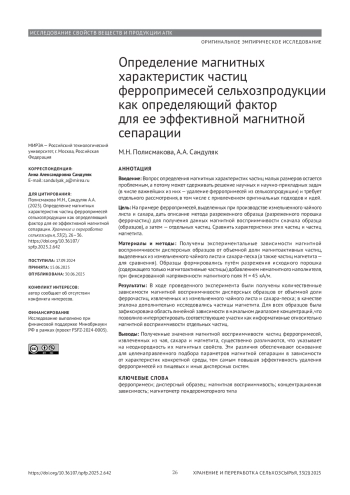 Введение: Вопрос определения магнитных характеристик частиц малых размеров остается проблемным, а потому может сдерживать решение научных и научно-прикладных задач (в числе важнейших из них - удаление ферропримесей из сельхозпродукции) и требует отдельного рассмотрения, в том числе с привлечением оригинальных подходов и идей.