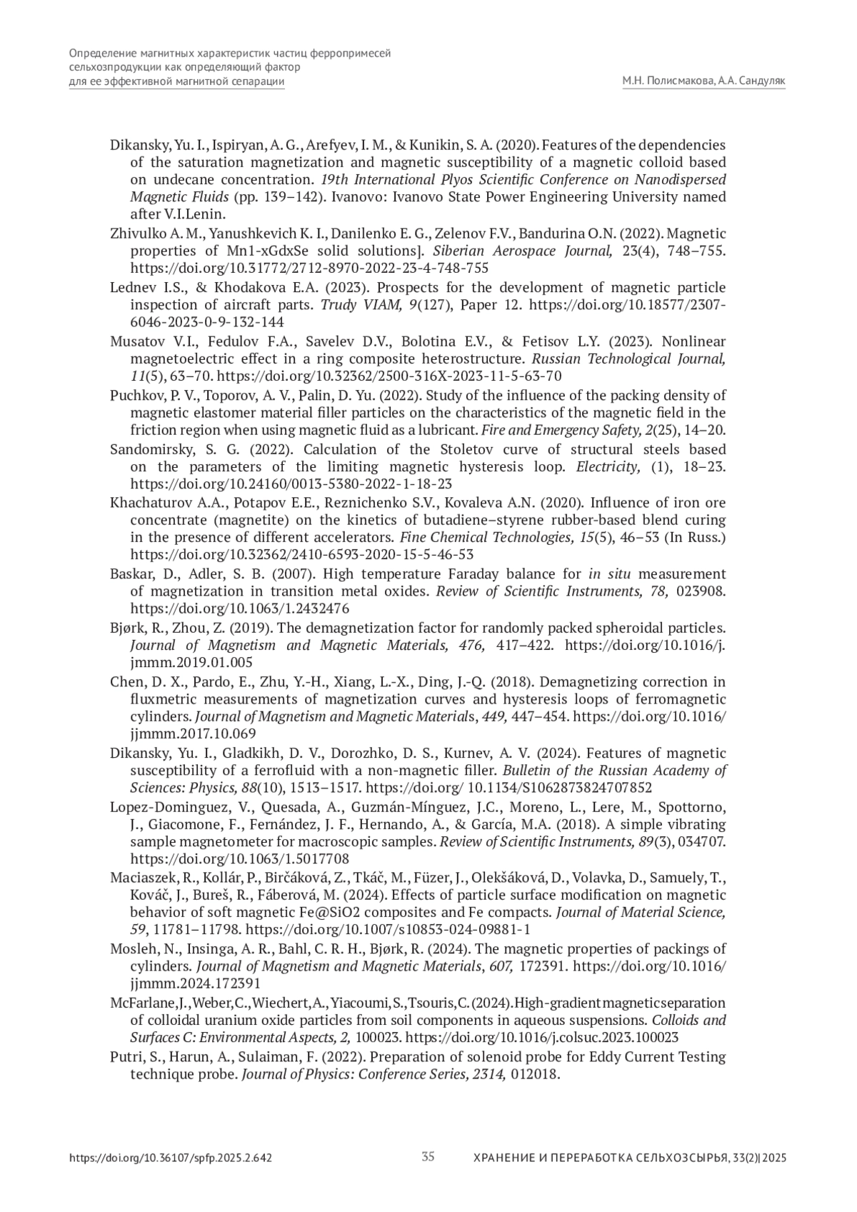 24. Sandulyak, D. А., Sandulyak, А. А., Кiselev, D. О., Sandulyak, А. V., Polismakova, М. N., Kononov, M. A., Ershova, V. А. (2017). Determining the magnetic susceptibility of ferroparticles from the susceptibility of their dispersive samples. Measurement Techniques, 60(9), 928-933. DOI: 10.1007/s11018-017-1295-z EDN: DWVKAQ