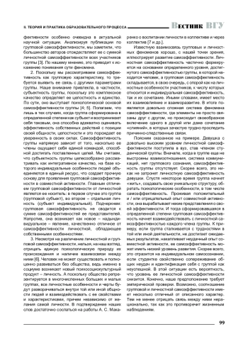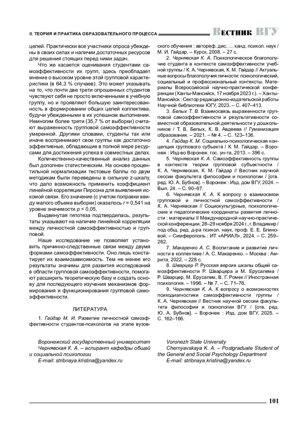 ЧЕРНЯВСКАЯ К. А. СВЯЗЬ ГРУППОВОЙ И ЛИЧНОСТНОЙ САМОЭФФЕКТИВНОСТИ (НА МАТЕРИАЛЕ СТУДЕНЧЕСКИХ ГРУПП) // ВЕСТНИК ВОРОНЕЖСКОГО ГОСУДАРСТВЕННОГО УНИВЕРСИТЕТА. СЕРИЯ: ПРОБЛЕМЫ ВЫСШЕГО ОБРАЗОВАНИЯ. 2025. № 3