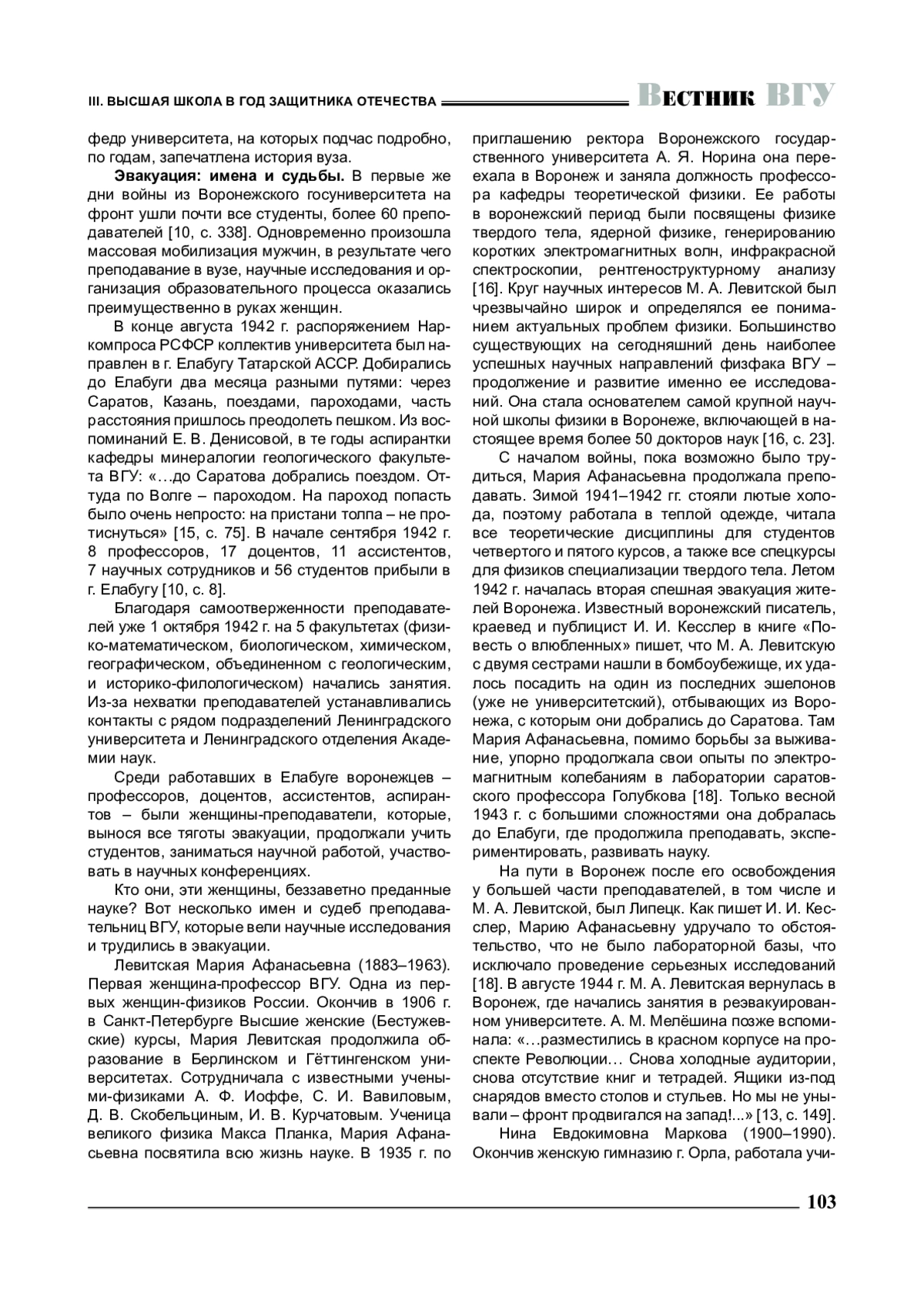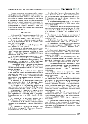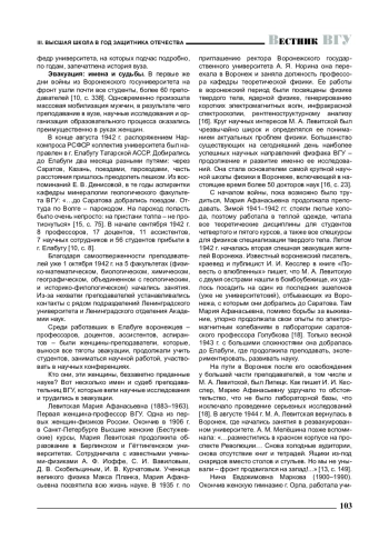 Ключевые фразы: женщины-преподаватели, ВОРОНЕЖСКИЙ ГОСУДАРСТВЕННЫЙ УНИВЕРСИТЕТ, ВЕЛИКАЯ ОТЕЧЕСТВЕННАЯ ВОЙНА, эвакуация, елабуга, послевоенная деятельность, самоотверженность, ГЕРОИЗМ