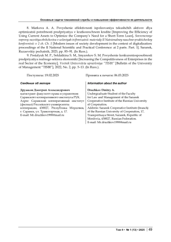 Markova A. A. Povyshenie effektivnosti ispolzovaniya tekushchih aktivov dlya optimizatsii potrebnosti predpriyatiya v kratkosrochnom kredite [Improving the Efficiency of Using Current Assets to Optimize the Company’s Need for a Short-Term Loan], Sovremennye voprosy razvitiya obshchestva v usloviyah tsifrovizatsii: materialy II Natsionalnoy nauchno-prakticheskoy konferentsii: v 2 ch. Ch. 1 [Modern issues of society development in the context of digitalization: proceedings of the II National Scientific and Practical Conference: at 2 parts. Part. 1]. Saransk, Ruzaevskiy pechatnik, 2023, pp. 85-91. (In Russ.).