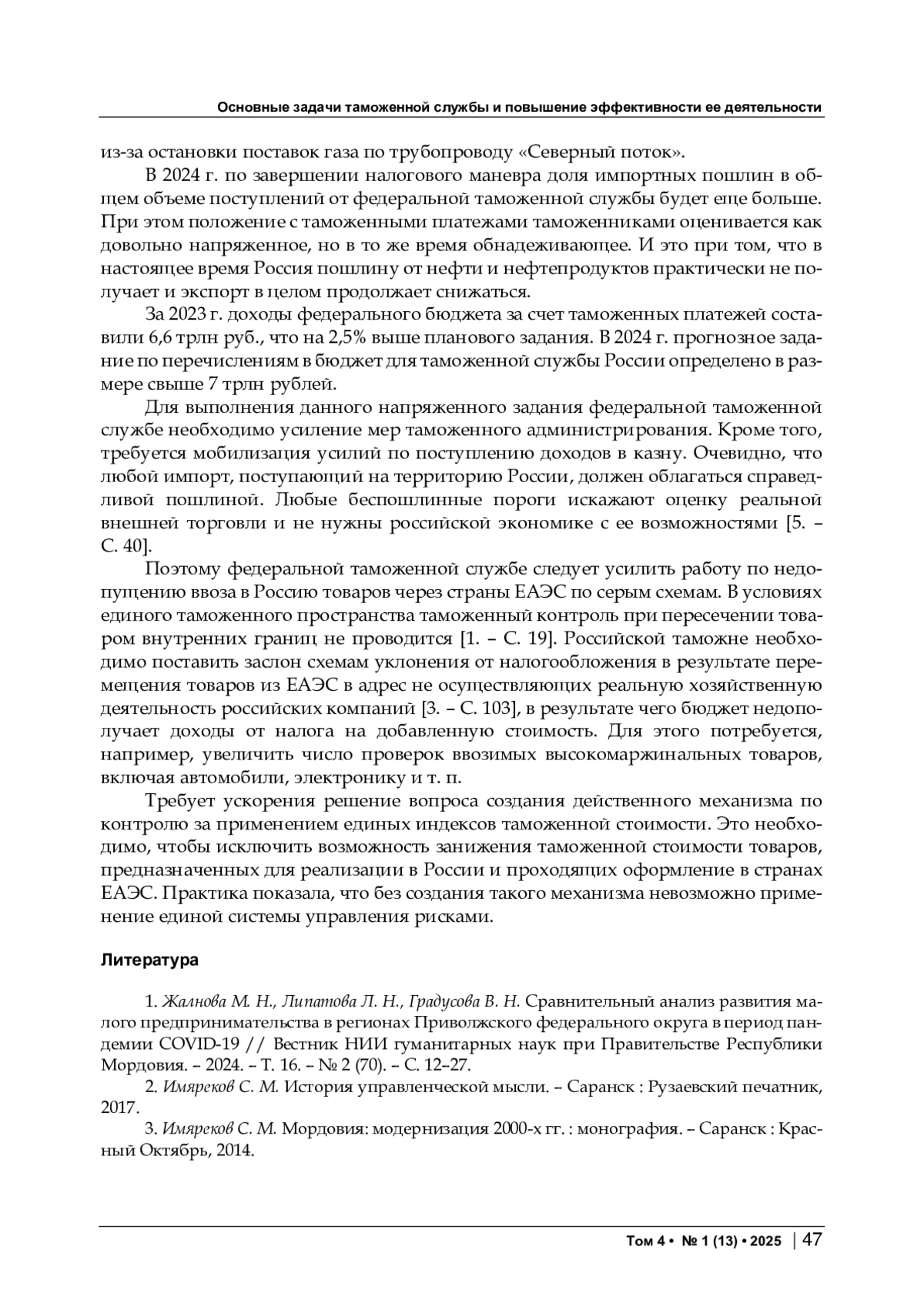 1. Жалнова М. Н., Липатова Л. Н., Градусова В. Н. Сравнительный анализ развития малого предпринимательства в регионах Приволжского федерального округа в период пандемии COVID-19 // Вестник НИИ гуманитарных наук при Правительстве Республики Мордовия. - 2024. - Т. 16. - № 2 (70). - С. 12-27. EDN: CUDHYU