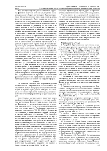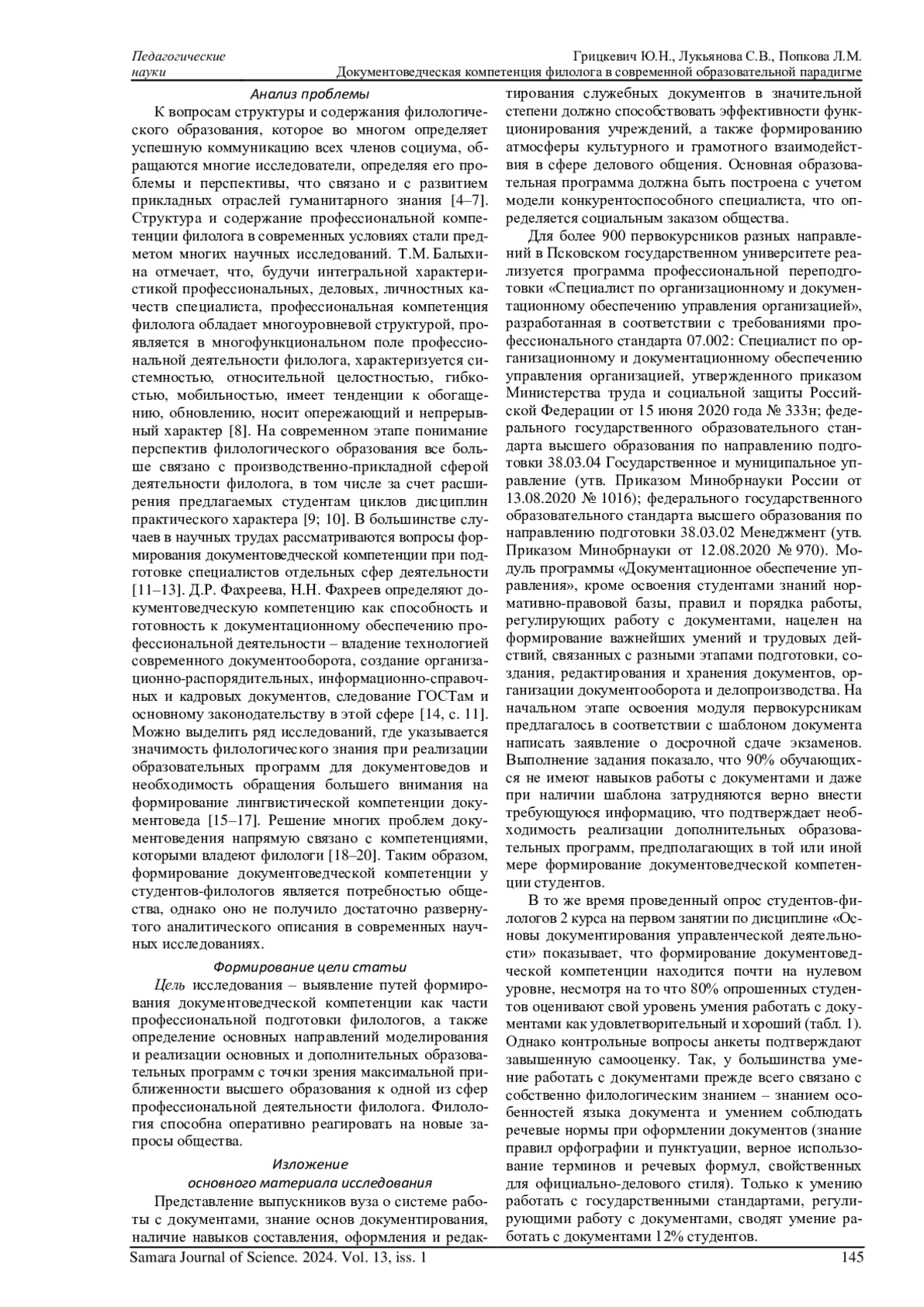 ГРИЦКЕВИЧ Ю. Н., ЛУКЬЯНОВА С. В., ПОПКОВА Л. М. ДОКУМЕНТОВЕДЧЕСКАЯ КОМПЕТЕНЦИЯ ФИЛОЛОГА В СОВРЕМЕННОЙ ОБРАЗОВАТЕЛЬНОЙ ПАРАДИГМЕ // САМАРСКИЙ НАУЧНЫЙ ВЕСТНИК. 2024. ТОМ 13, № 1