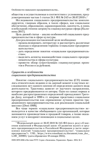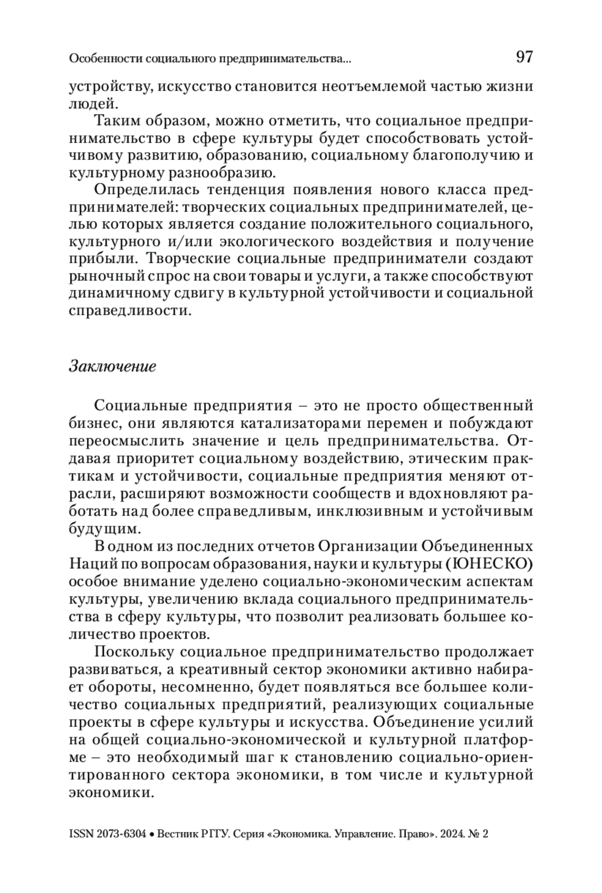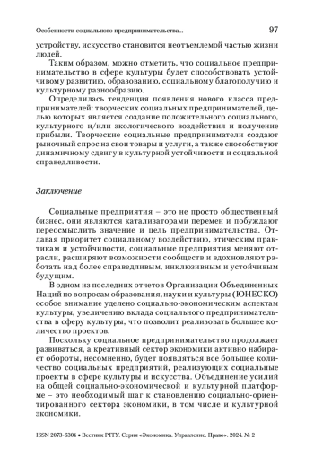 На сегодняшний день социальное предпринимательство является одним из наиболее динамично развивающихся видов предпринимательской деятельности и выступает, наряду с государственными структурами, драйвером социокультурных изменений в обществе. Используя предпринимательский подход, социальные предприниматели решают актуальные социальные проблемы и действуют, исходя из общественных интересов. Возможность оперативного реагирования на возникающие запросы общества, удовлетворение потребностей разных категорий населения, предоставление равного доступа и новых возможностей, способствующих социально-экономической адаптации и построению инклюзивного общества, являются определяющими для развития института социального предпринимательства. Специфика такого вида деятельности определяется конкретной сферой, в рамках которой реализуются, к примеру, социокультурные проекты. Рост интереса к сфере культуры и тенденция активной поддержки проектов в данной сфере обусловили цель настоящей статьи – анализ особенностей социокультурного предпринимательства.