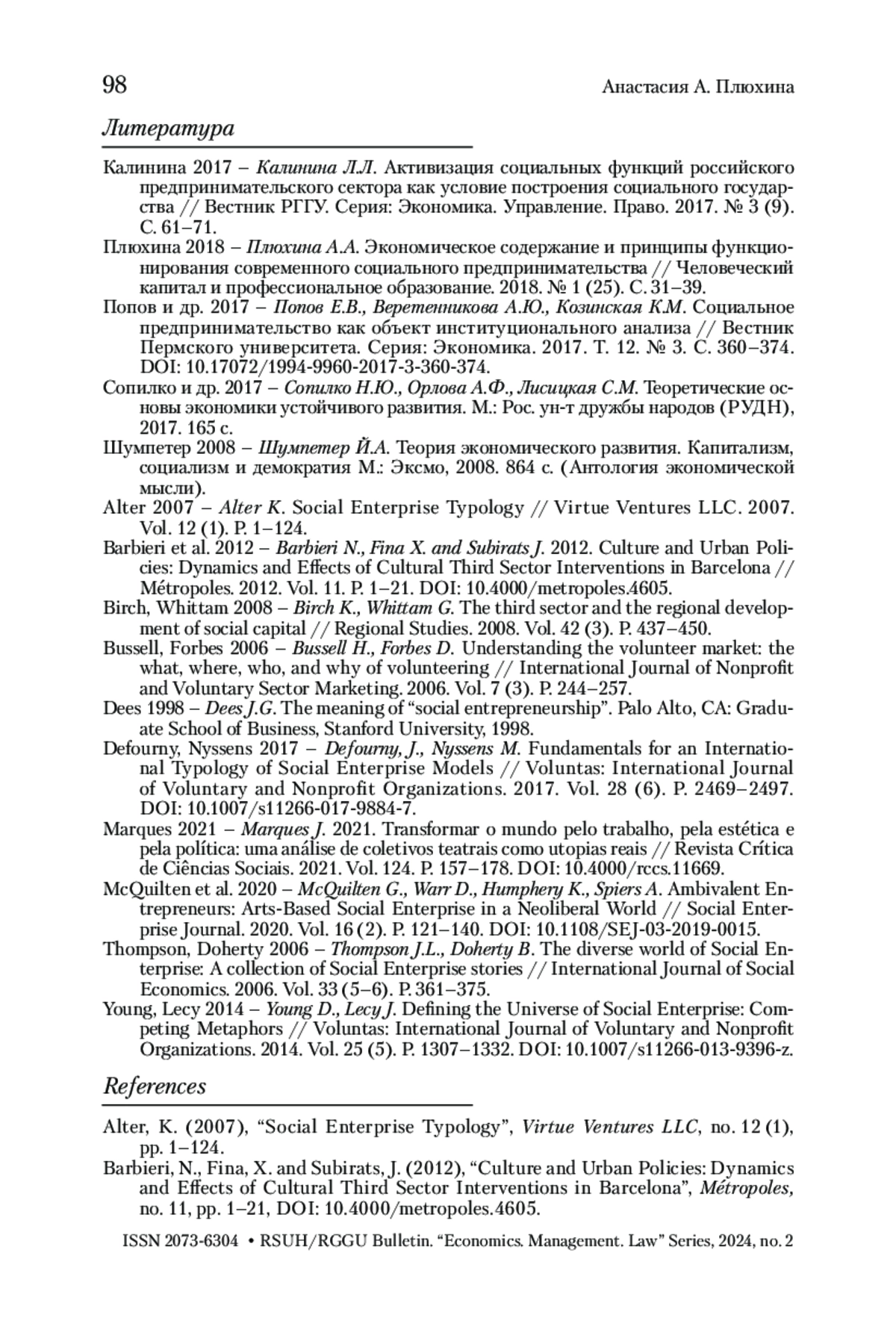 3. Попов и др. 2017 - Попов Е.В., Веретенникова А.Ю., Козинская К.М. Социальное предпринимательство как объект институционального анализа // Вестник Пермского университета. Серия: Экономика. 2017. Т. 12. № 3. С. 360-374. https://doi.org/10.17072/1994-9960-2017-3-360-374.