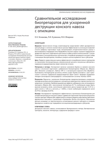 Выводы: Исследование подтвердило эффективность применения биопрепаратов для ускоренной деструкции конского навоза с древесной подстилкой. Наилучшие результаты показал препарат «Феркон ДН», эффективность которого, вероятно, обусловлена действием ферментного комплекса с целлюлазой и бактериями Bacillus thuringiensis. Полученные данные указывают на перспективность использования данного препарата в условиях фермерских хозяйств при переработке лигноцеллюлозосодержащих субстратов.
