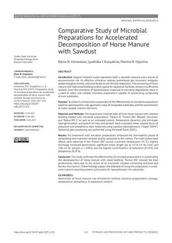 Введение: Органические отходы животноводства представляют собой одновременно ценный ресурс и источник экологических рисков. Эффективная их утилизация позволяет снизить выбросы парниковых газов, контролировать эпидемиологические угрозы и восстанавливать плодородие почв. Переработка конского навоза с высоким содержанием древесной подстилки, характерного для конных клубов, остаётся малоизученной. С учетом устойчивости лигноцеллюлозных компонентов к микробной деградации актуален отбор и валидация биопрепаратов, способных ускорить компостирование таких субстратов.