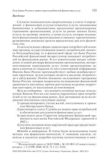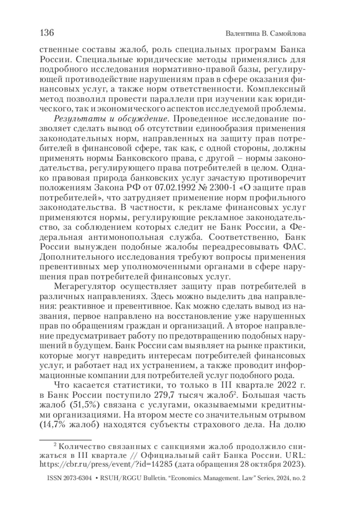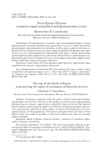САМОЙЛОВА В. В. РОЛЬ БАНКА РОССИИ В ЗАЩИТЕ ПРАВ ПОТРЕБИТЕЛЕЙ ФИНАНСОВЫХ УСЛУГ // ВЕСТНИК РГГУ. СЕРИЯ: ЭКОНОМИКА. УПРАВЛЕНИЕ. ПРАВО. 2024. № 2