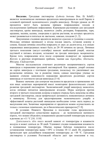11. Арестова Н.О., Рябчун И.О. Влияние метеорологических условий и комбинированного инсектоакарицида на изменение вредоносности гроздевой листовертки // Плодоводство и виноградарство Юга России. 2023. № 79(1). С. 218-229. EDN: OWRWEL