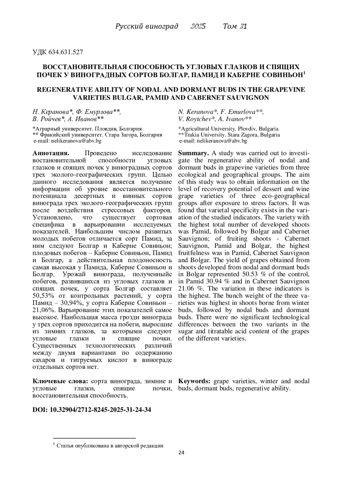 2. Крумов С., Илиев А., Иванов М. Изучение морозостойкости винных сортов винограда в контролированных условиях // Растениеводные науки. 2020. № 57, 3. С. 45–49.