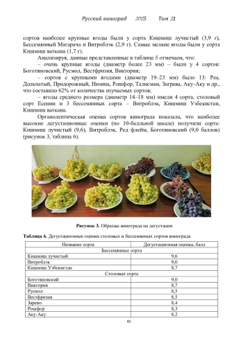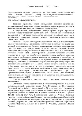 Приведены результаты изучения в 2024 году увологических показателей столовых и бессемянных сортов винограда, произрастающих на Донской ампело-графической коллекции имени Я. И. Потапенко (г. Новочеркасск, Ростовская область). Сорта изучали в привитой культуре (подвой Кобер 5ББ), схема посадки 3,0×1,5 м. Изучение сортов проводили с использованием общепринятых в виноградарстве методик. Объектом исследований был 21 столовый и бессемянный сорт винограда, различного происхождения и срока созревания. Очень высокая сахаристость сока ягод была у сортов: Беркарат, Низина, Аку-Аку, Кишмиш Узбекистан. Титруемая кислотность у изучаемых сортов была в пределах от 4,2 г/дм3 (Вестфризия) до 9,6 г/дм3 (Кишмиш ваткана). Наиболее крупные грозди были у 10 сортов, среди них: Бессемянный Магарача, Кишмиш Узбекистан, Кишмиш лучистый, Витроблэк, Боготя-новский, Реа, Аку-Аку и др. Очень крупные ягоды (по диаметру) были у 4 сортов – Боготяновский, Русмол, Вестфризия, Виктория. Наибольшая средняя масса ягоды была у сортов ‒ Боготяновский (9,1 г), Вестфризия (7,2 г), Русмол (6,9 г), Дольчатый (6,8 г). Среди бессемянных сортов наиболее крупные ягоды были у сорта Кишмиш лучистый (3,9 г). Наиболее высокие дегустационные оценки (по 10-балльной шкале) получили сорта: Кишмиш лучистый (9,6), Витроблэк, Боготяновский (9,0 баллов). По данным проведенных исследований выделены по комплексу увологических показателей столовые сорта ‒ Боготяновский, Русмол, Вестфризия, Виктория; среди бессемянных сортов ‒ Витроблэк, Кишмиш лучистый, Кишмиш Узбекистан.
