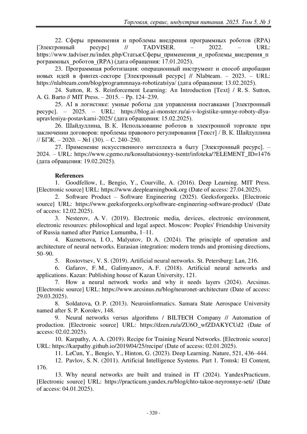 1. Goodfellow, I. Deep Learning [Electronic resource] / I. Goodfellow, Y. Bengio, A. Courville // MIT Press. - 2016. - URL: https://www.deeplearningbook.org (Date of access: 27.04.2025).