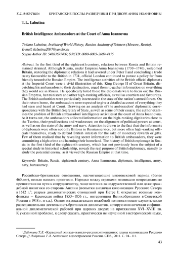 3. Лабутина Т.Л. Британские разведчики в России (XVI-XVIII вв.) // Многоликость целого: из истории цивилизаций Старого и Нового света. Сборник статей в честь Виктора Леонидовича Малькова. М., 2011. С. 389-411.