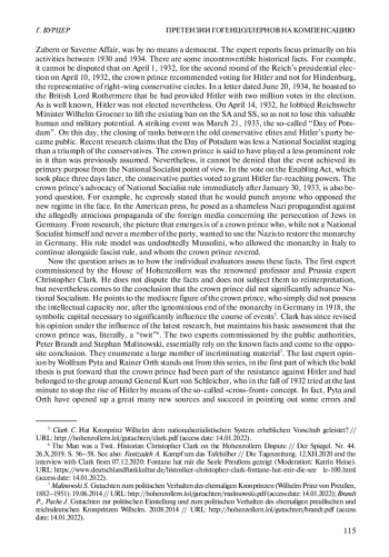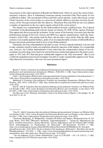 В статье идет речь о дискуссии по поводу компенсации, которой хотел добиться от Бранденбурга нынешний глава дома Гогенцоллернов принц Георг Фридрих. Юридической основой для этих претензий является Закон о компенсации, который гарантировал адекватное возмещение собственникам, которые подверглись экспроприации со стороны Советской военной администрации в Германии в 1945 г. Однако в 1994 г. из этого закона были исключены те, кто сотрудничал с национал-социалистическим или коммунистическим режимами или призывал к этому других. Прецеденты применения этого положения уже имеются. Ключевой вопрос состоял в том, насколько значительную помощь оказывал тогдашний кронпринц Вильгельм нацистскому режиму. Специалисты, обнаружив немало новых источников, предъявили многочисленные факты его сотрудничества с нацистами еще до их прихода к власти. Однако другие эксперты считают, что интеллектуальный уровень кронпринца был не таков, чтобы он мог представлять серьезную политическую фигуру, и поддержка, оказанная им нацистам, была в действительности весьма незначительной. Дискуссии вокруг этого вопроса, как и следовало ожидать, приобрели политическую окраску. Основными источниками по данному вопросу являются экспертные заключения, которые обе стороны в споре заказали известным специалистам. С одной стороны, приводятся бесспорные факты, а с другой – обсуждаются дискуссионные оценки. Кроме того, рассматривается политическая и юридическая оценка спора. Использованные в статье материалы позволяют сделать выводы о культуре свидетелей-экспертов в Федеративной Республике Германии и условиях работы историков.