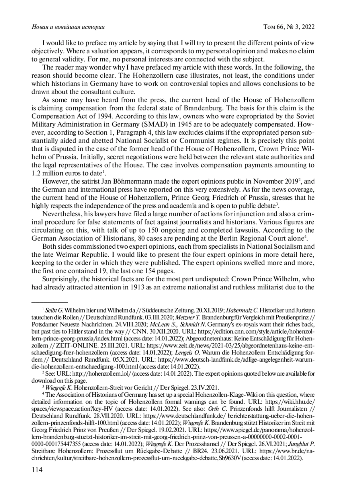 ВУРЦЕР Г. ПРЕТЕНЗИИ ГОГЕНЦОЛЛЕРНОВ НА КОМПЕНСАЦИЮ // НОВАЯ И НОВЕЙШАЯ ИСТОРИЯ. 2022. № 3