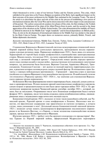 Ключевые фразы: международные отношения, Ближний Восток, антанта, ТУРЦИЯ, СИРИЯ, лозаннская конференция 1922-1923 гг, рурский кризис 1922-1923 гг, лозаннский договор 1923 г