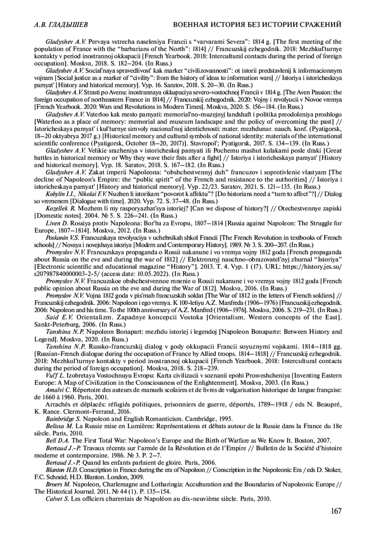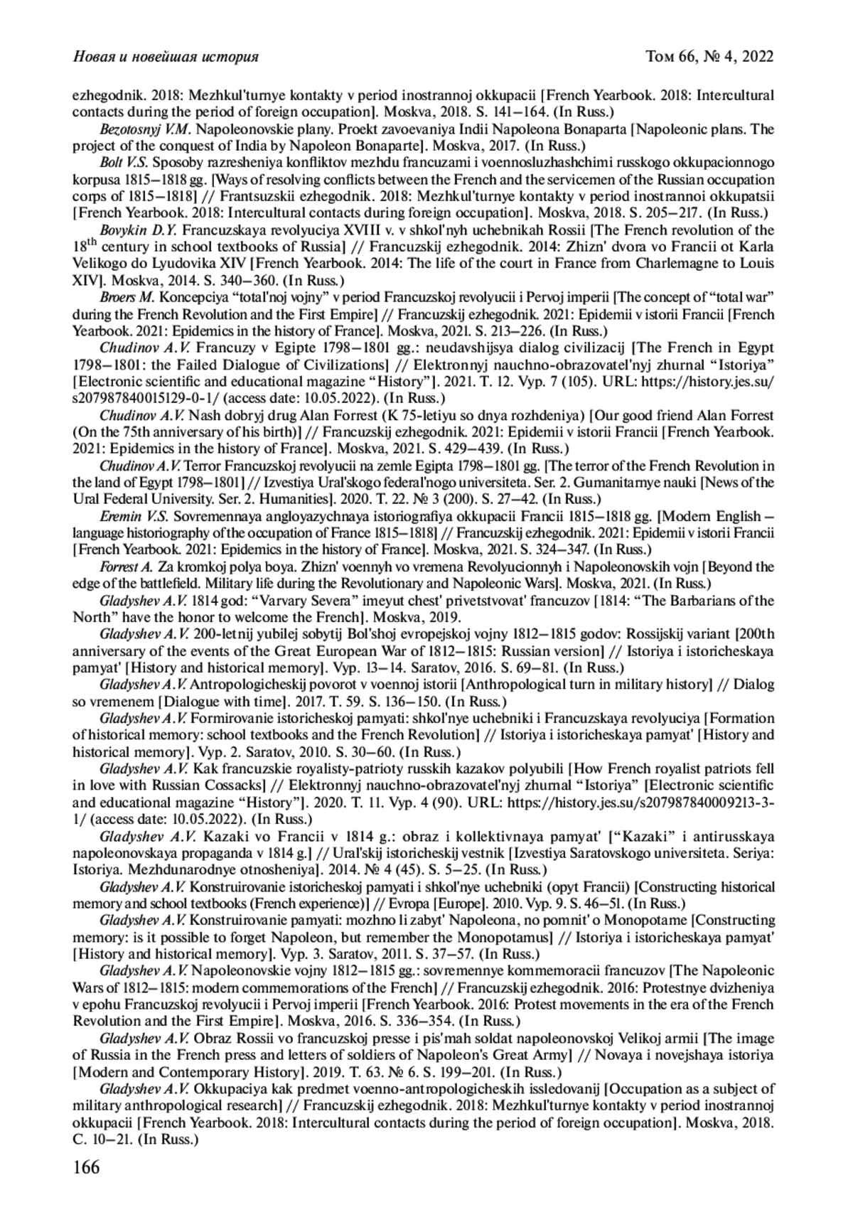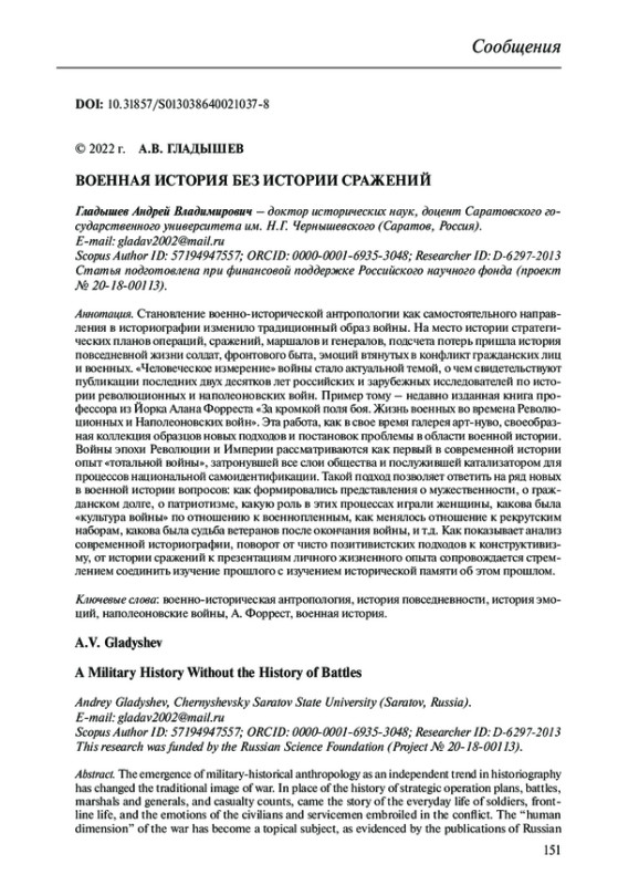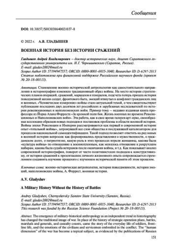 ГЛАДЫШЕВ А. В. ВОЕННАЯ ИСТОРИЯ БЕЗ ИСТОРИИ СРАЖЕНИЙ // НОВАЯ И НОВЕЙШАЯ ИСТОРИЯ. 2022. № 4