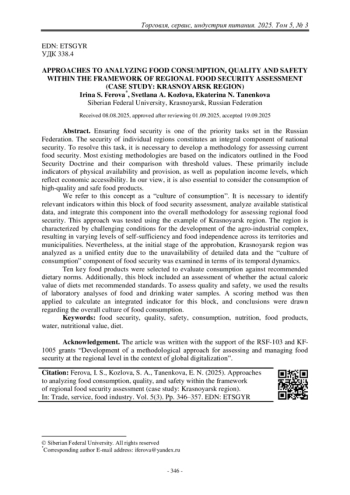 5. Колесняк, А. А. Экономическая доступность продовольствия: региональный аспект [Текст] / А. А. Колесняк, Н. М. Полянская // Вестник Кемеровского государственного университета. Серия: Политические, социологические и экономические науки. – 2021. – № 4(22). – С. 538–547.