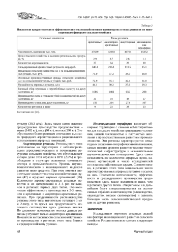 Рассматривается влияние перетоков знаний как фактора инновационного развития на эффективность и интенсивность сельскохозяйственного производства в регионах России. Проанализировано территориальное распределение аграрных патентов и ссылок на них в регионах страны, что является одним из методов выявления перетоков знаний. На этой основе была проведена типология регионов России по инновационным функциям сельского хозяйства и уровню креативности. Было выделено четыре типа регионов: креативные, акцепторно-креативные, акцепторные и инновационная периферия. Для каждого типа проанализированы показатели патентной активности, уровня инновационного развития, среднедушевого производства, эффективности и интенсивности сельскохозяйственного производства. Выявлено, что самое эффективное сельское хозяйство характерно для регионов креативного типа, что свидетельствует о значительном влиянии инновационных факторов на современное развитие сельского хозяйства. Эффективность сельскохозяйственного производства закономерно понижается в акцепторных регионах и инновационной периферии. Значительное влияние на инновационное развитие сельского хозяйства регионов страны имеет наличие высших учебных заведений и научных организаций аграрного профиля. В то же время научно-технологические факторы в настоящее время не являются ведущими в развитии аграрной отрасли, что открывает большие возможности для дальнейшего повышения технологичности и эффективности сельского хозяйства.
