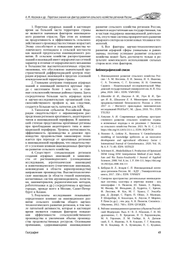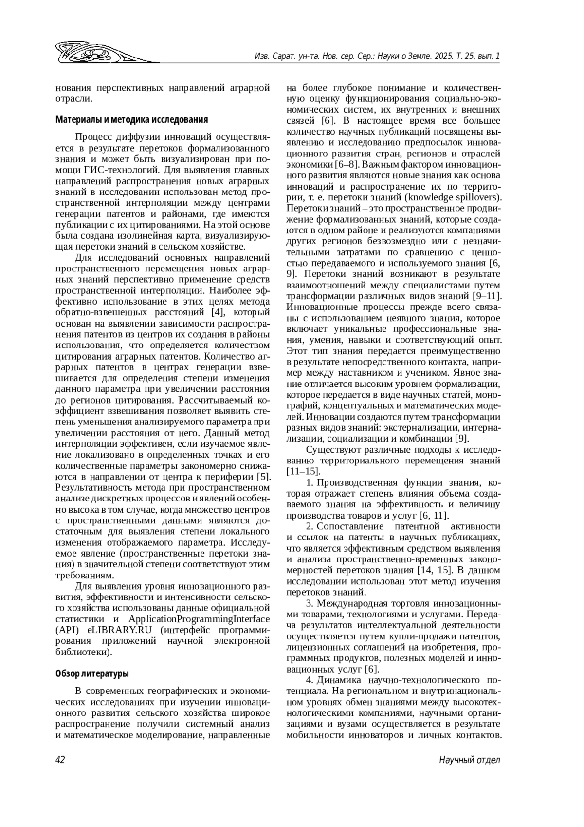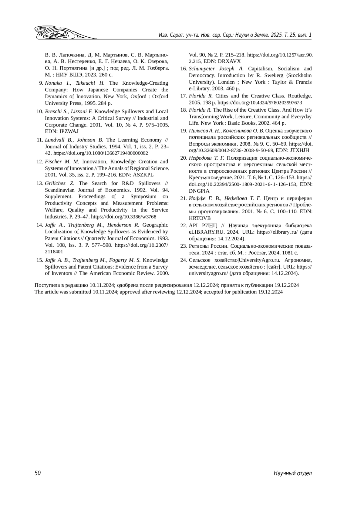 НОСОНОВ А. М., ЧЕРНОБРОВКИНА В. А., ШУРР А. В. ПЕРЕТОКИ ЗНАНИЯ КАК ФАКТОР РАЗВИТИЯ СЕЛЬСКОГО ХОЗЯЙСТВА РЕГИОНОВ РОССИИ // ИЗВЕСТИЯ САРАТОВСКОГО УНИВЕРСИТЕТА. НОВАЯ СЕРИЯ. СЕРИЯ НАУКИ О ЗЕМЛЕ. 2025. Т. 25 № 1