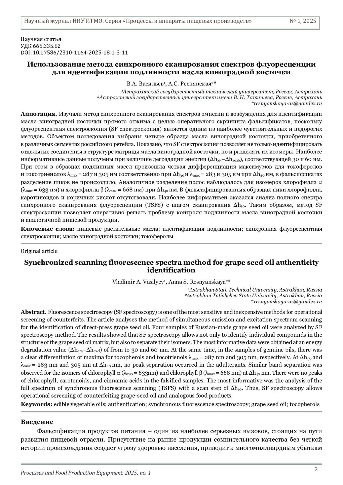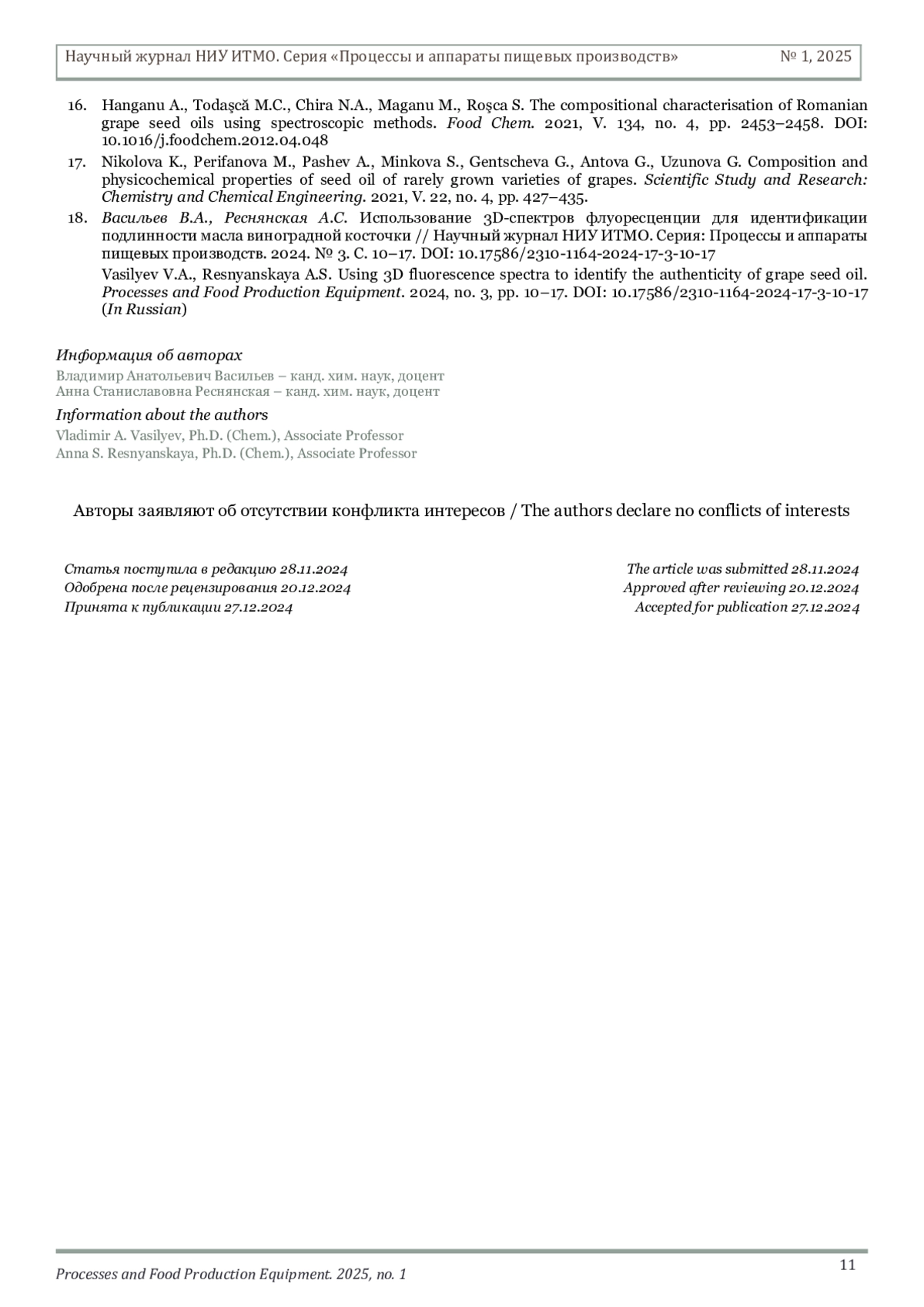 18. Васильев В.А., Реснянская А.С. Использование 3D-спектров флуоресценции для идентификации подлинности масла виноградной косточки // Научный журнал НИУ ИТМО. Серия: Процессы и аппараты пищевых производств. 2024. № 3. С. 10-17.