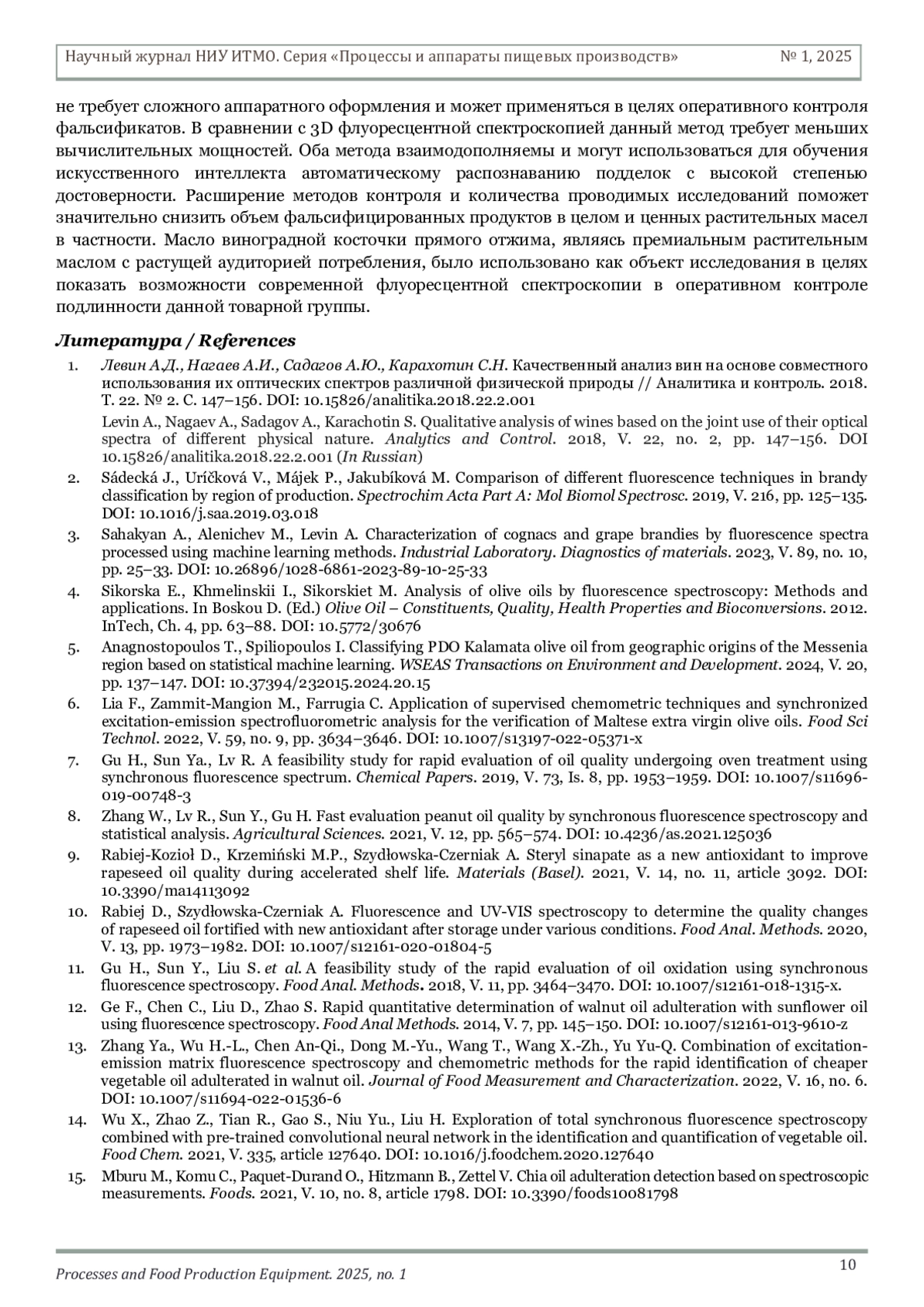 1. Левин А.Д., Нагаев А.И., Садагов А.Ю., Карахотин С.Н. Качественный анализ вин на основе совместного использования их оптических спектров различной физической природы // Аналитика и контроль. 2018. Т. 22. № 2. С. 147-156. DOI: 10.15826/analitika.2018.22.2.001