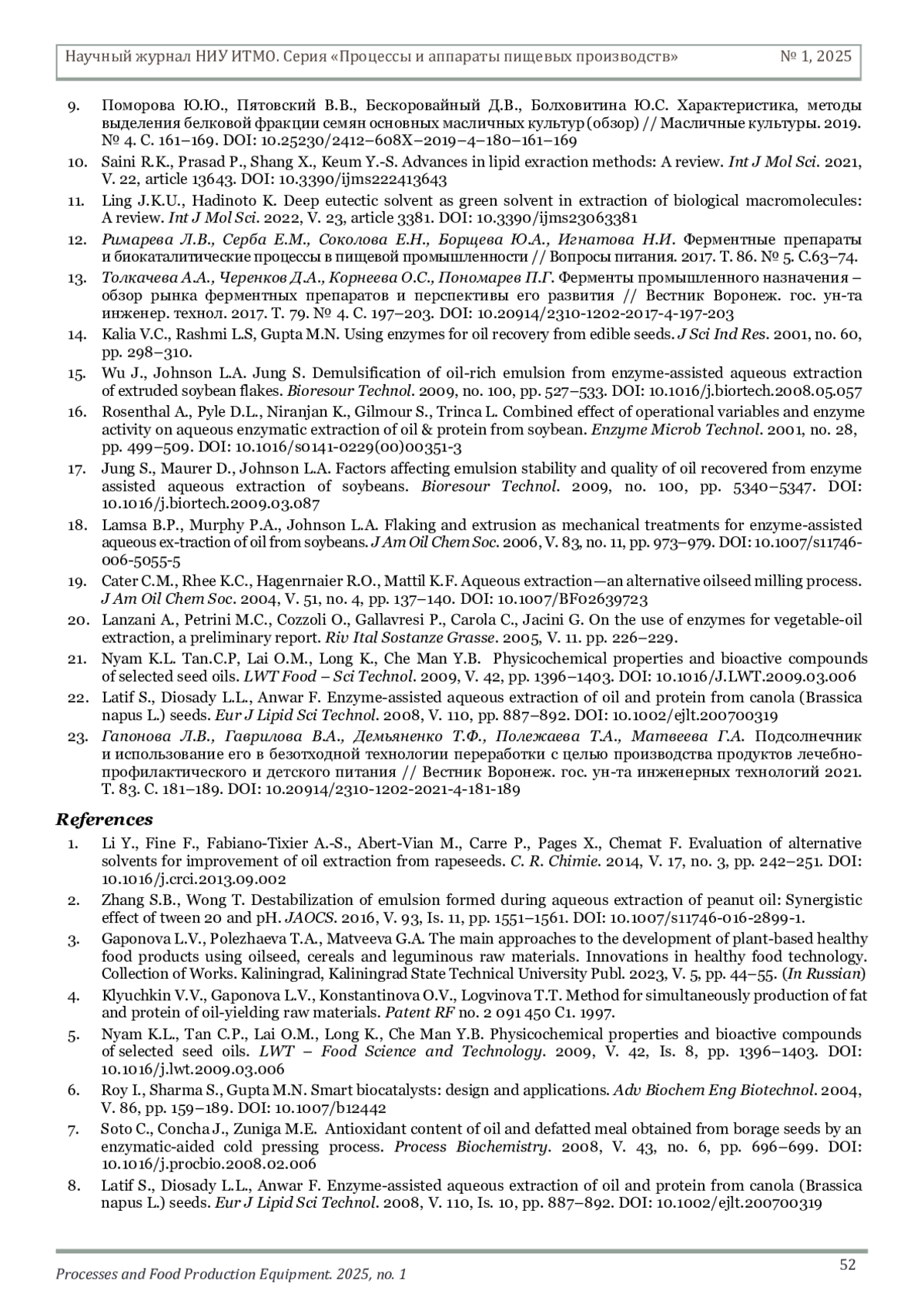 9. Поморова Ю.Ю., Пятовский В.В., Бескоровайный Д.В., Болховитина Ю.С. Характеристика, методы выделения белковой фракции семян основных масличных культур (обзор) // Масличные культуры. 2019. № 4. С. 161-169. Х-2019-4-180-161-169. DOI: 10.25230/2412-608