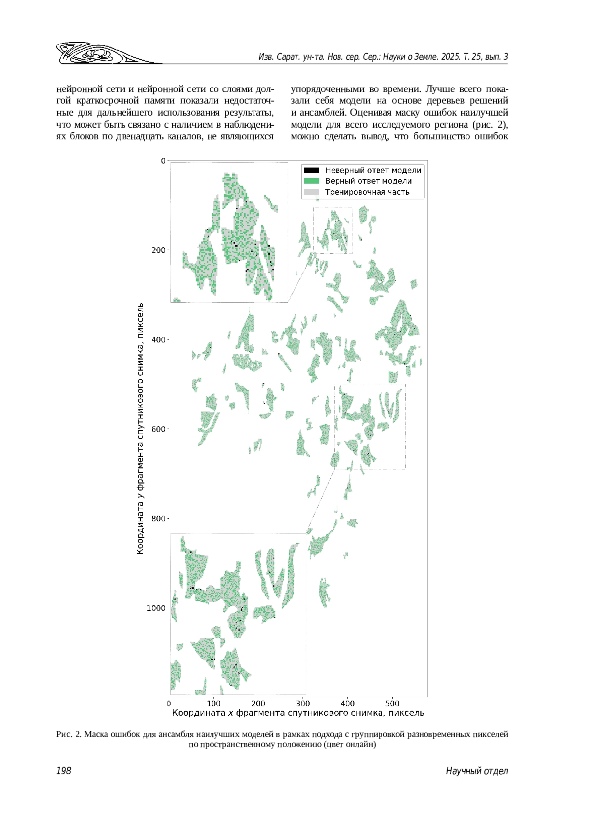 1. Макаров В. З., Гусев В. А., Шлапак П. А., Решетарова Д. А. Выбор оптимального метода распознавания сельскохозяйственных культур по космоснимкам высокого разрешения (на примере саратовского Заволжья) // Известия Саратовского университета. Новая серия. Серия: Науки о Земле. 2020. Т. 20, вып. 3. С. 162-170. ,. DOI: 10.18500/1819-7663-2020-20-3-162-170 EDN: EBJEPG